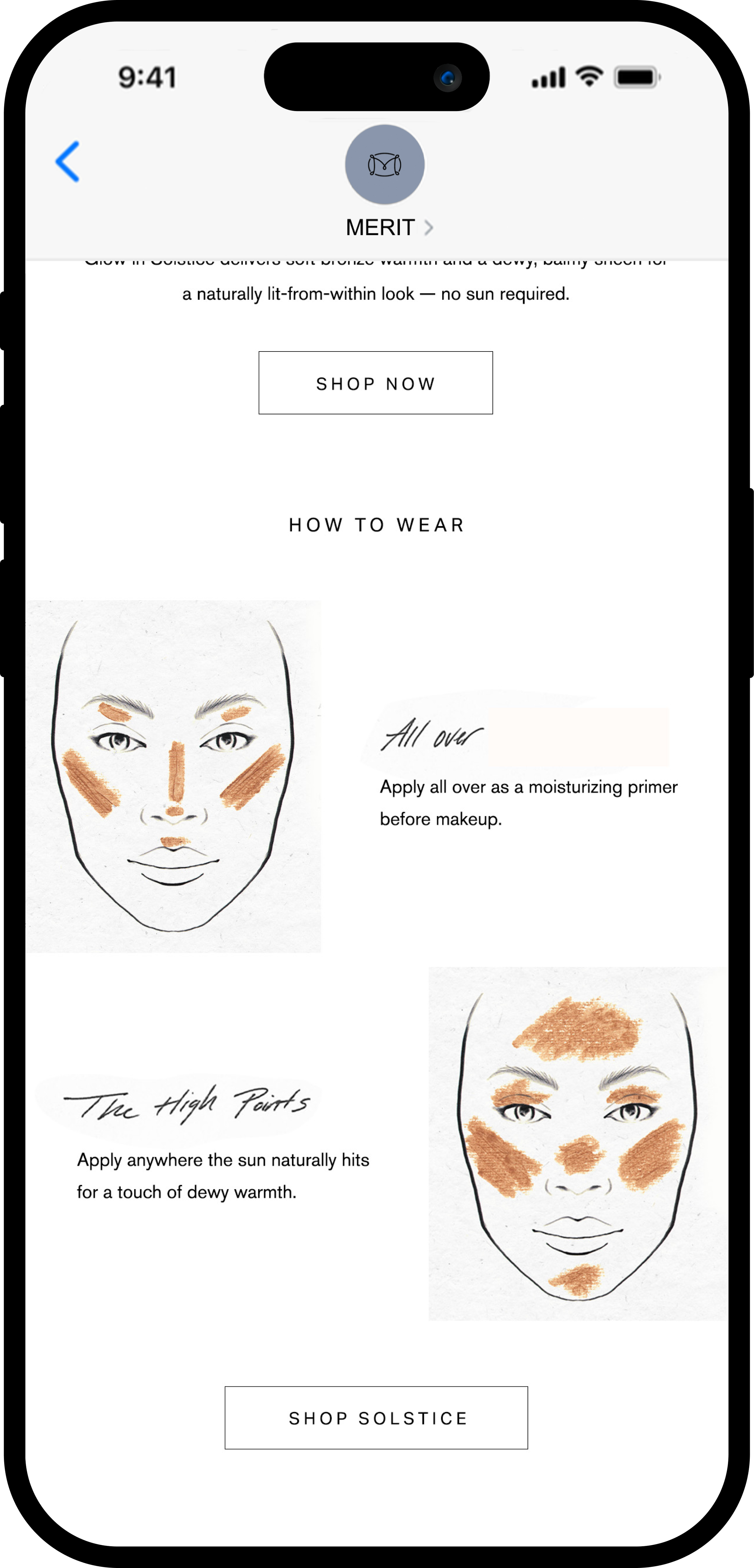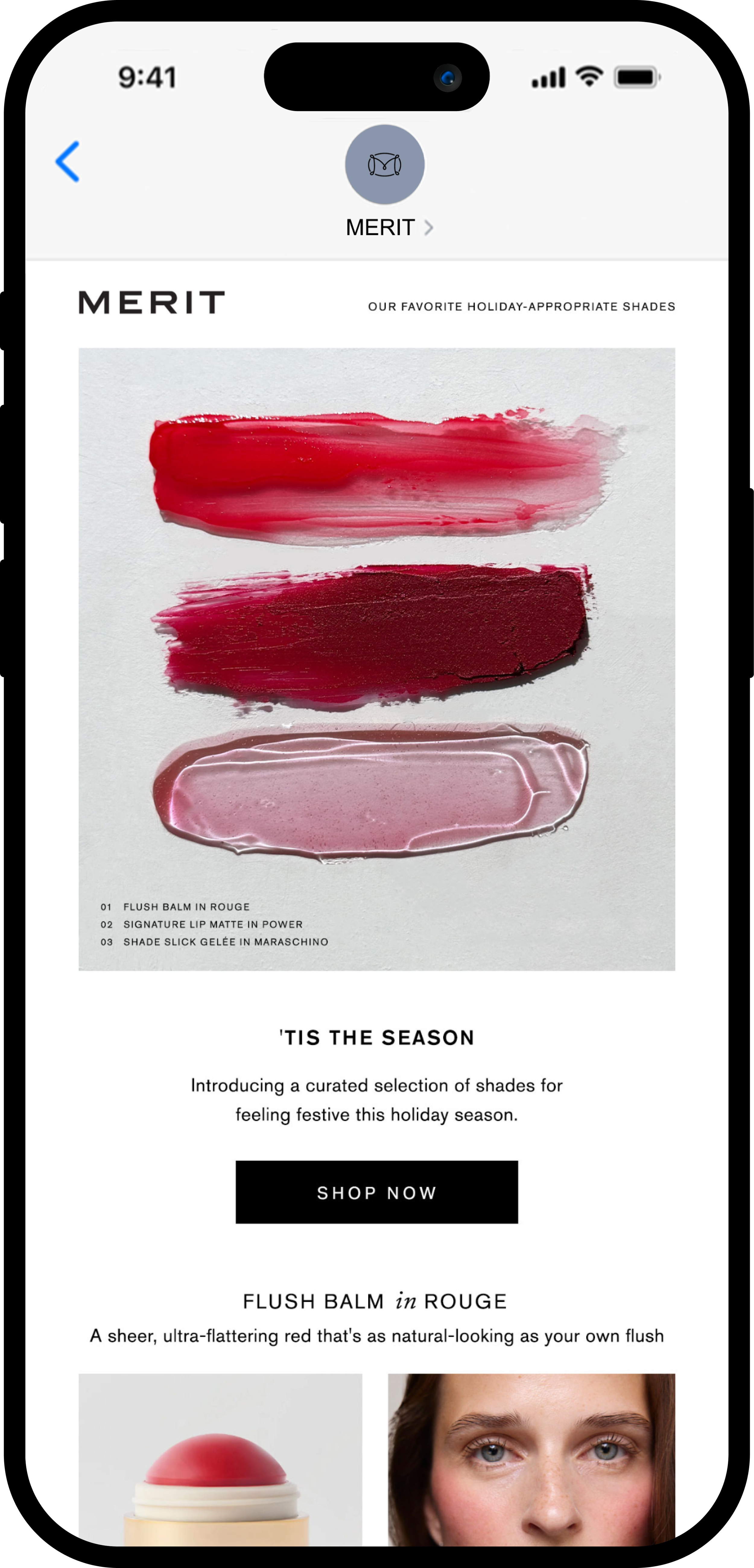 Developed a coordinated set of CRM emails, MMS assets, and IG stories highlighting key seasonal offers and products: a free-shipping promotion, a curated selection of red shades for the holidays, and a feature on MERIT’s Day Glow highlighting balm in Solstice. Each asset was designed for clarity, visual impact, and brand consistency, creating a cohesive multi-channel experience that supported engagement and conversion across the customer journey.